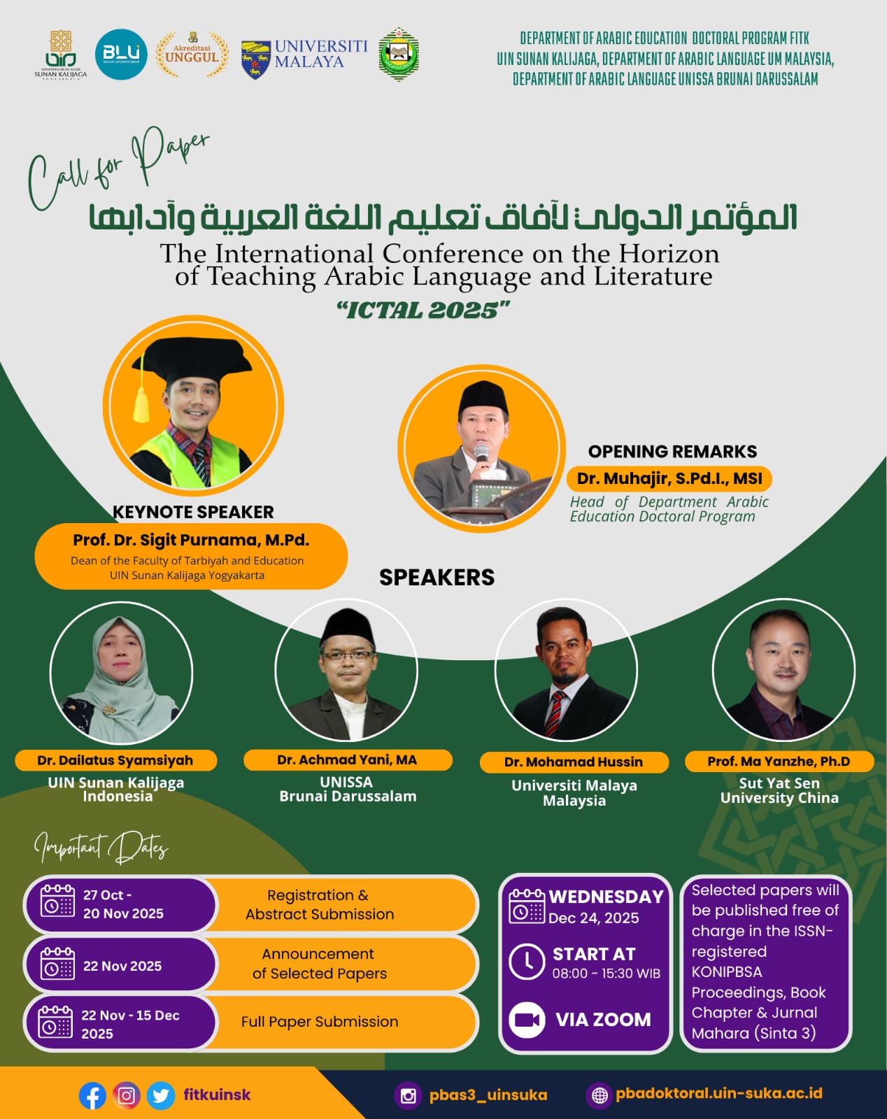 Flyer The International Conference on the Horizon of Teaching Arabic Language and Literature (ICTAL) 2025 Sabtu, 22 November 2025 22:43:11 WIB Dilihat : 14 Kali Unduh